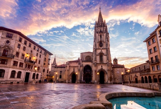 Más tarde cruzamos los imponentes paisajes de la Cordillera Cantábrica en dirección a Asturias. Llegamos a OVIEDO a media tarde, donde realizaremos (en ocasiones al día siguiente por la mañana) una visita guiada de una hora y media. Descubriremos su catedral del siglo IX, el Palacio Calatrava, el teatro Campoamor y la animada calle de la Rua. Finalizamos con una cena típica asturiana en una auténtica sidrería.